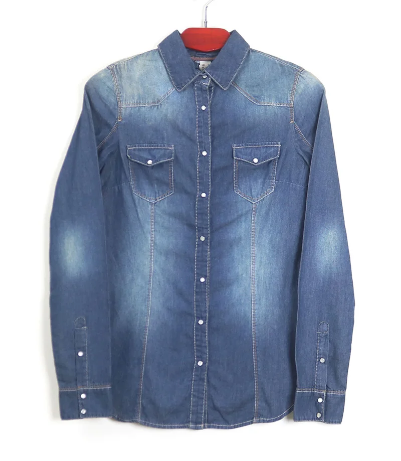 Women’s L/S Double Pocket Double Flap Pearl-Snap Button Denim Shirt (Enzyme Blasting Wash)